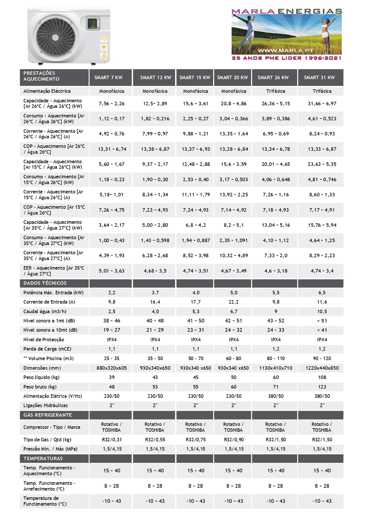 Bomba de calor Piscina Smart Inverter com potências de 7 a 20kW preparada para o aquecimento de águas de piscinas ou de aquários, controlador integrado com Display LED e controlo via Wi-Fi. Novo gás frigorigéneo R32. Funcionamento em quase todas condições ambientais. Permutador de calor em titânio.